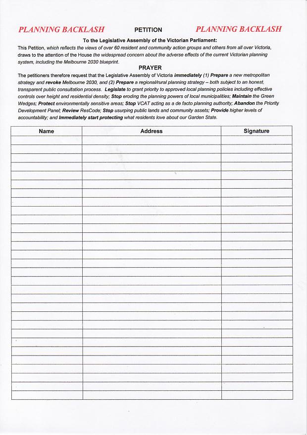 (3/7/06 - SP) Planning Backlash petition asks the State Legislative Assembly for big changes to how planning operates in Victoria