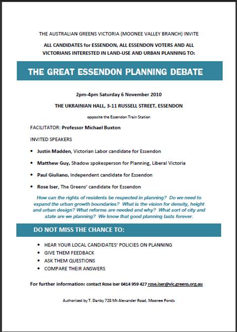 Meet Candidates for the State Seat of Essendon including current Planning Minister Justin Madden. (It is not known then if he will attend but irrespective of this we must be there.)