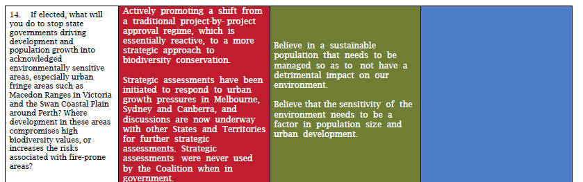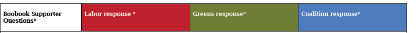 Go to the Boobook Declaration website http://www.boobook.org.au/whats_new.htm for more detailed information and responses to all Boobook questions from each party.