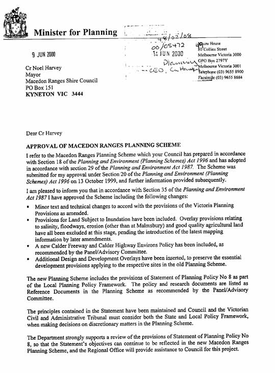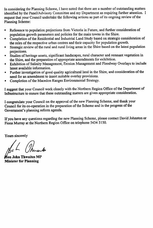 Planning Minister John Thwaites' letter approving Macedon Ranges' new planning scheme, June 2000, conditional upon work being done. Most of that work has still not been done.
